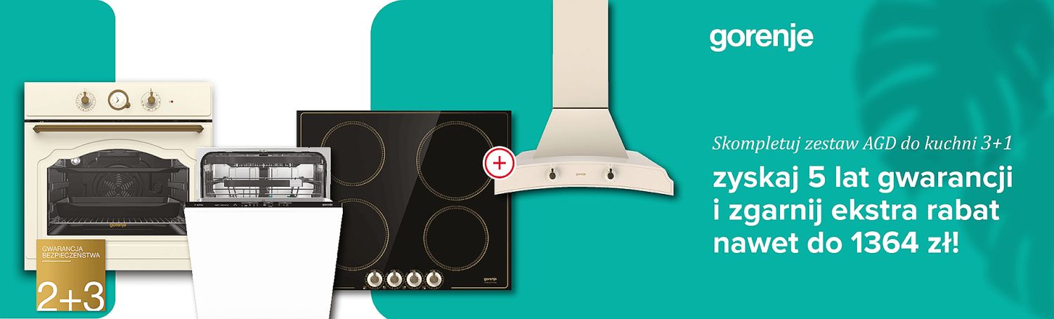 Jeżeli zdecydujemy się na zakup czterech urządzeń Gorenje w zestawie, na najtańszy produkt otrzymamy aż 65% rabatu. Z tak wysoką zniżką możemy zgarnąć okap kominowy w stylu retro, płytę gazową lub płytę indukcyjną, ale nie tylko.