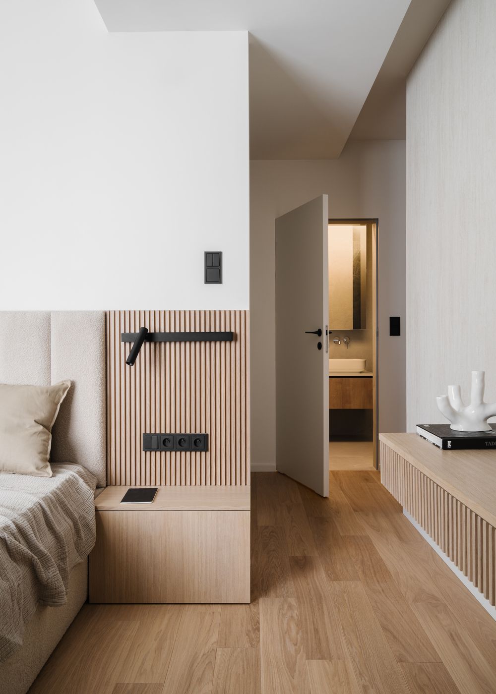 Minimalistyczny projekt apartamentu opiera się na przytulnych kolorach ziemi i naturalnych materiałach inspirowanych przyrodą. Beże, złamane biele oraz odcienie drewna dominują w przestrzeni, nadając wnętrzu ciepła i harmonii. Drewniany parkiet w słomkowym odcieniu i fornirowane meble dodają elegancji, podczas gdy delikatnie przyciemniona stolarka wprowadza wyrafinowany kontrast.